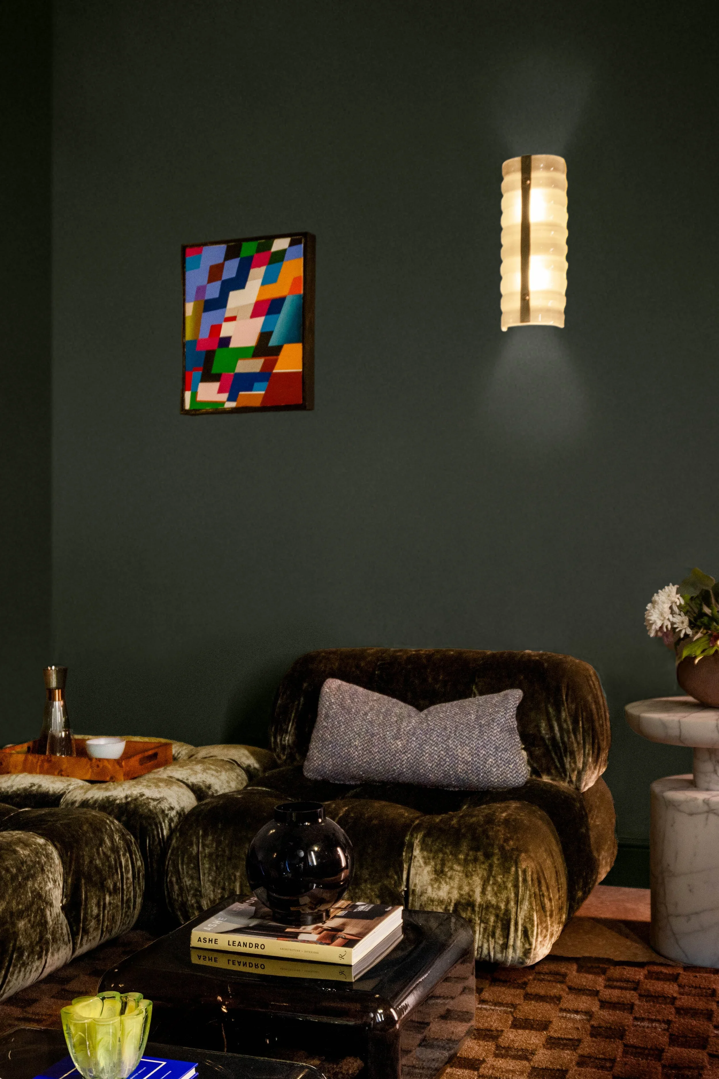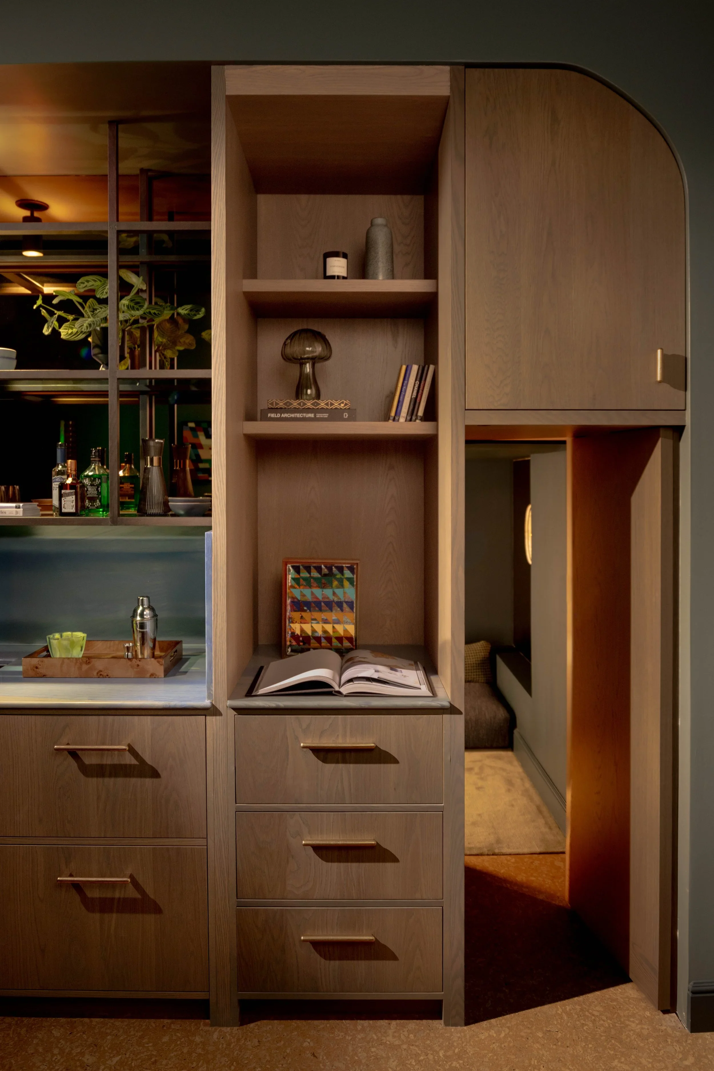 We knew we wanted to add a bar and utilized the existing closet space to completely re-work the space. We always approach our projects with intention and that the interiors feel at one with the volume of the space. We added a barrel vault at the entry to give you a sense of wonder as you come down the stairs. You are greeted with a custom neon sign and handsome powder room that we also renovated. A custom green wool carpet was made specifically for the staircase, creating a soft landing as you come down the stairs. Mixing unique materials is a passion of ours - we built a palette of cork, greyed oak, blue quartzite and tinted mirror. This mix of textures, warm & cool tones and finishes creates a space that feels lived in - yet modern.
