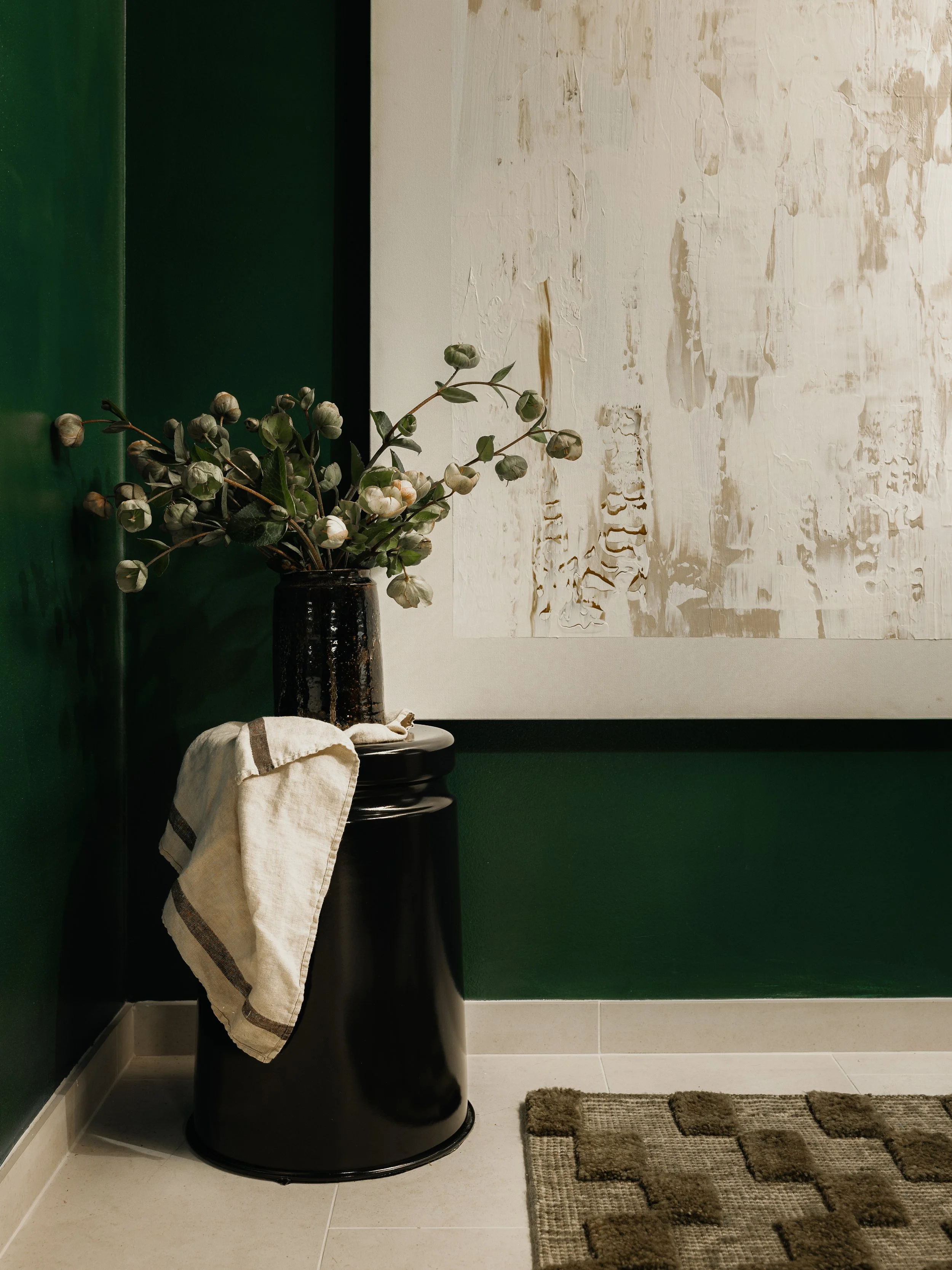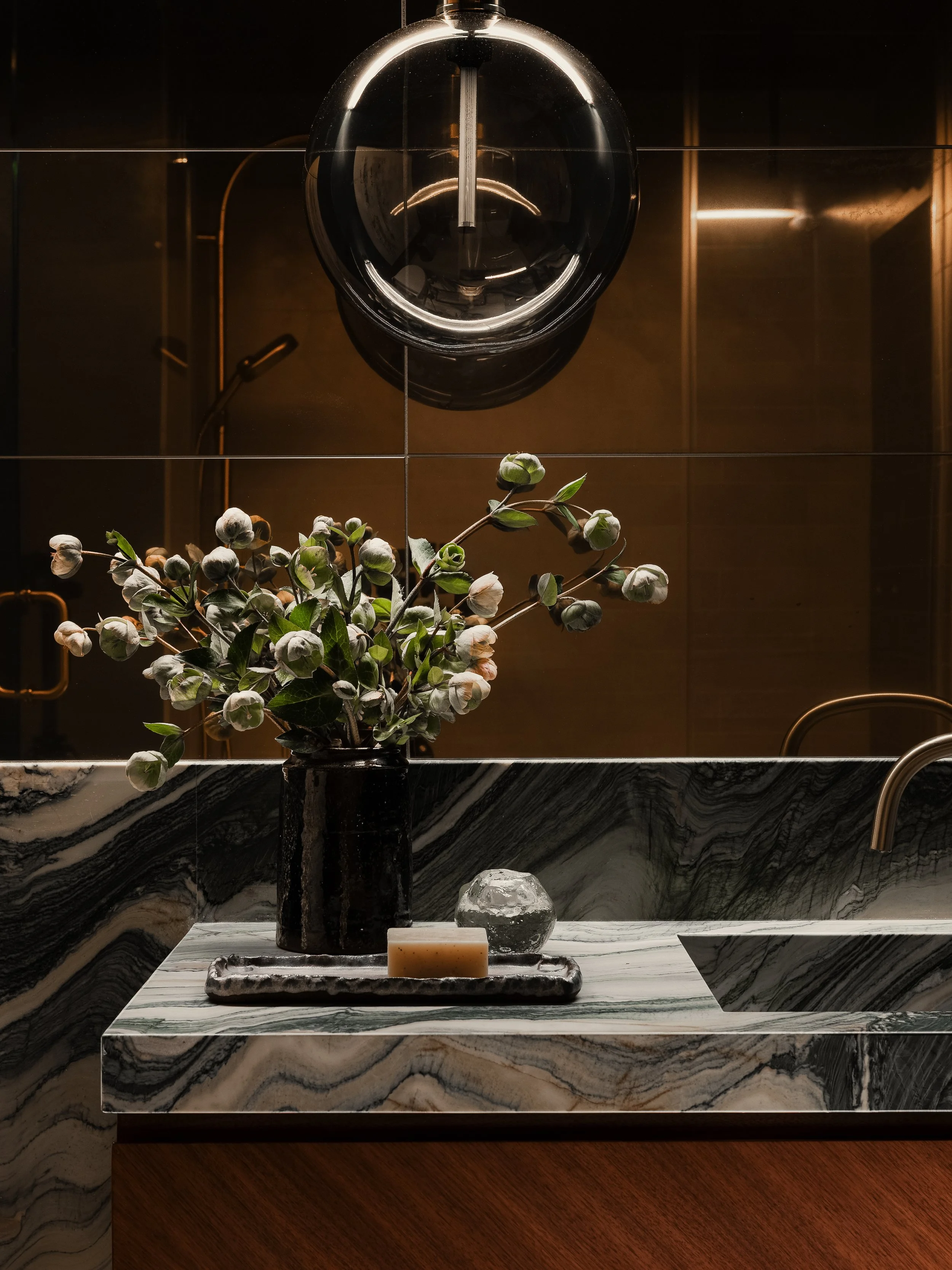 DESIGNED AS AN IMMERSIVE SENSORY EXPERIENCE, THIS BATHROOM TRANSFORMS A FUNCTIONAL SPACE INTO A MOMENT OF UNEXPECTED DRAMA. THE DESIGN IS ANCHORED BY A STRIKING, HEAVILY VEINED GREEN MARBLE THAT FLOWS SEAMLESSLY FROM THE WAINSCOTING TO THE CUSTOM INTEGRATED SINK. WE CONTRASTED THIS ORGANIC MOVEMENT WITH THE STRUCTURED WARMTH OF RICH WALNUT CABINETRY AND THE REFLECTIVE GLOW OF GOLD MIRROR TILE. SOFT COVE LIGHTING AND A GLASS DOME PENDANT ENHANCES THE MOODY ATMOSPHERE, CREATING A LUXURIOUS, INTIMATE RETREAT THAT FEELS MILES AWAY FROM THE ORDINARY.