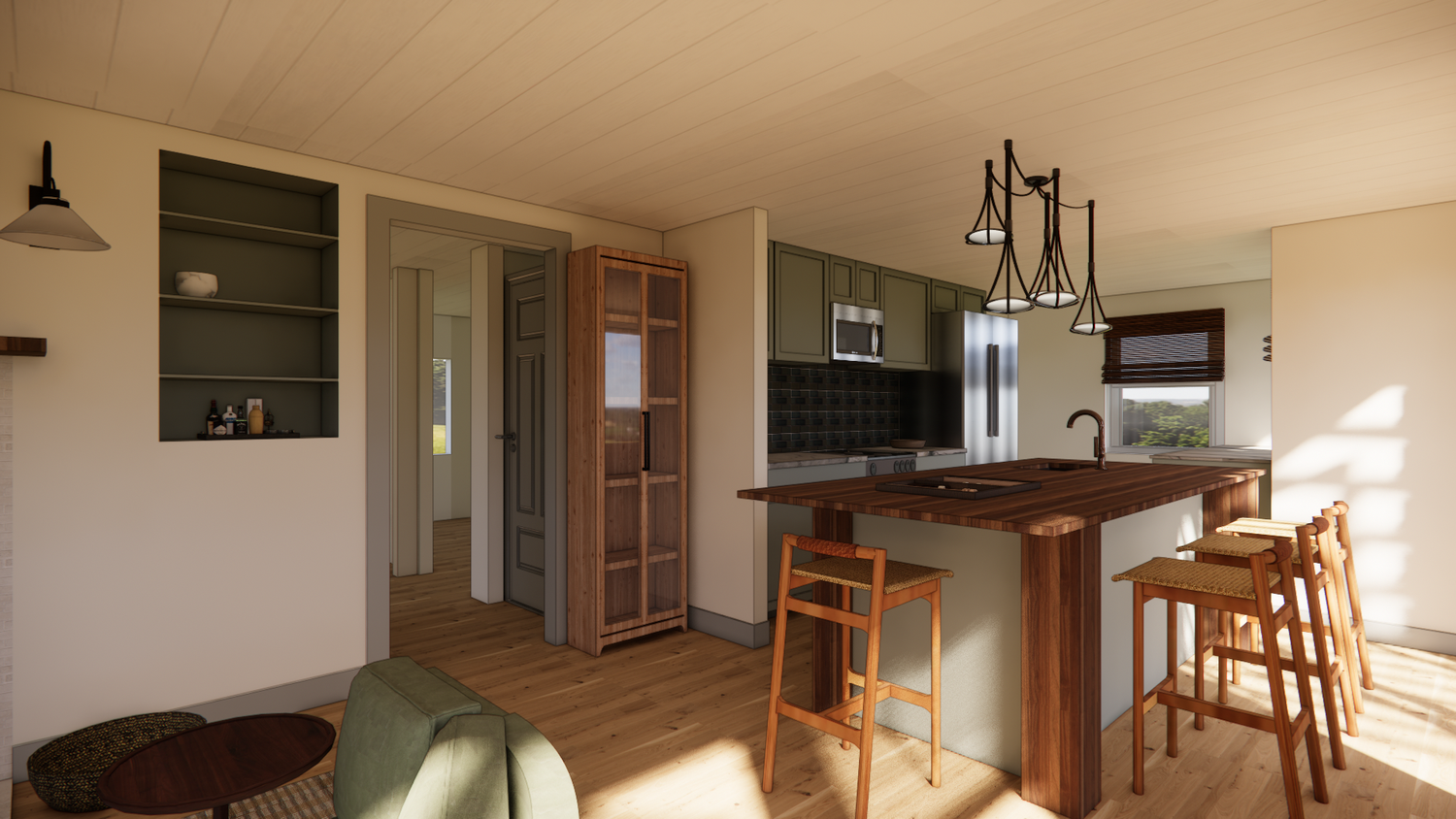Phases - Concept, Schematic, Design Development & Construction AdministrationThis Cape Cod bathroom remodel brings a modern, textural edge to a classic bungalow home. Soft green walls, handmade tile, and a dramatic veined stone countertop introduce richness while staying grounded in an organic palette. Clean, floating cabinetry and understated hardware keep the space feeling light and contemporary, while cobble stone tile flooring nods subtly to the home’s coastal roots. The mix of checkered tile, plaster, and natural materials adds depth without overwhelming the compact footprint. The result is a refined, character-driven bath that marries Cape Cod charm with refined natural materials.
